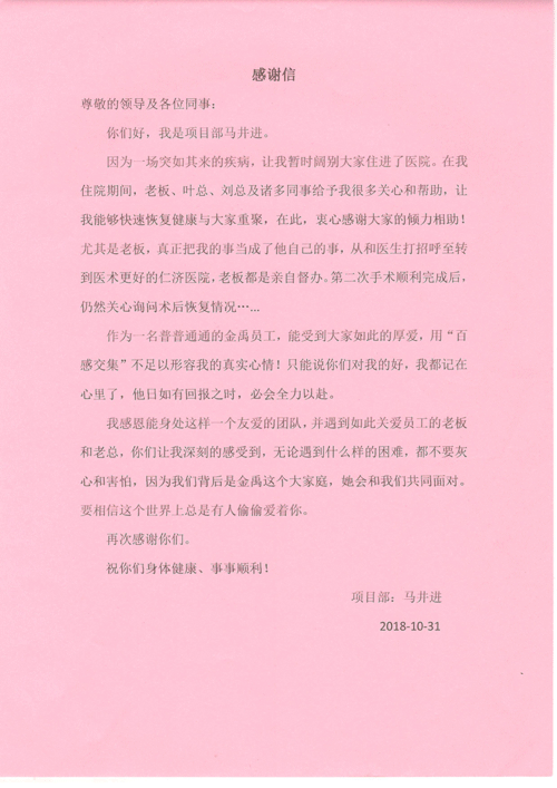 金禹公司员工王安宝,因突发脑溢血住院,公司及时伸出了爱心之手