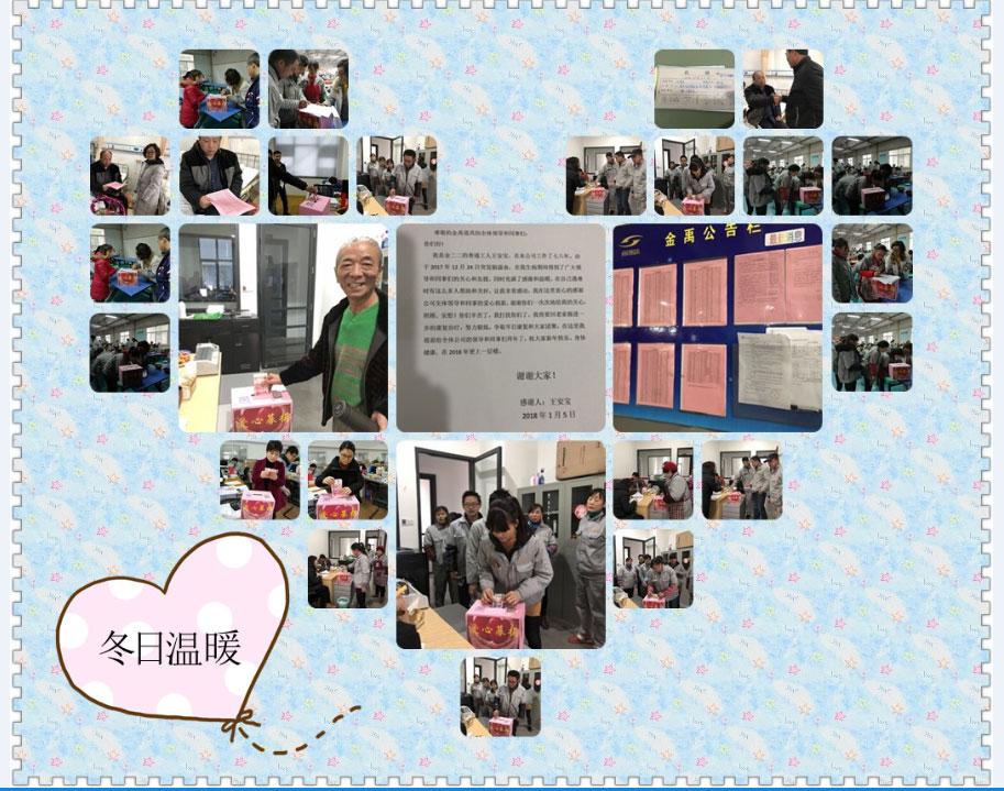 金禹公司员工王安宝,因突发脑溢血住院,其家庭困难,公司及时伸出了爱心之手,2018年1月为其举行了全公司的捐款活动.送上我们公司冬日的温暖。